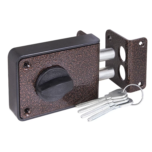 Замок накладной ЗН 1-3-1 предназначен для деревянных и металлических дверей. Корпус замка выполнен из ударопрочного АБС-пластика со стальной пластиной, ригели из стали. Имеется блокировка открывания двери ключом снаружи. Изнутри замок запирается ручкой. 2 класс секрета. Количество секретных комбинаций: 15 000. Два ригеля диаметром 14 мм. Цвет: медь. Комплектация: замок, цилиндровый механизм МЦ-1, 4 английских ключа, ответная планка, 1 накладка, крепежная фурнитура.