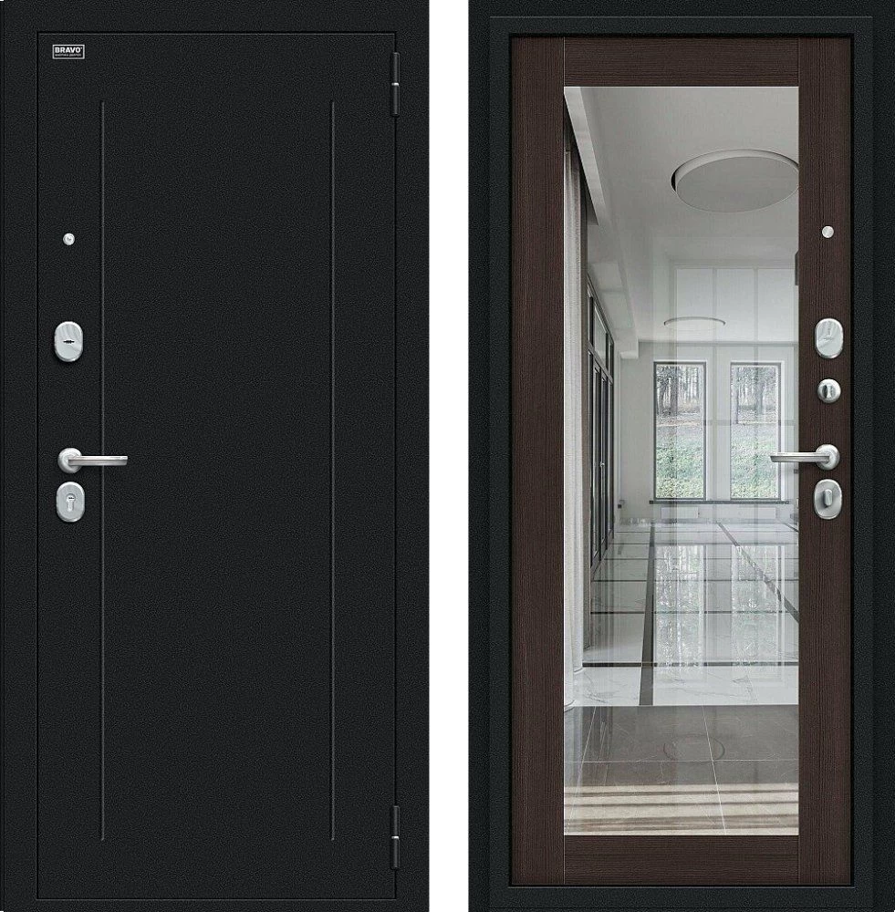 Надежная входная Дверь Браво Флэш Букле черное/Wenge Veralinga премиум класса по цене 32 637 руб. Большая толщина стали защитит от проникновения в ваш дом, квартиру или коттедж. Используется очень качественная фурнитура: замки, цилиндры, ручки, защелки. Покрытие и отделка двери изготовлено под внимательным контролем производителя. Дверь имеет долгий срок службы и гарантию.